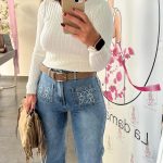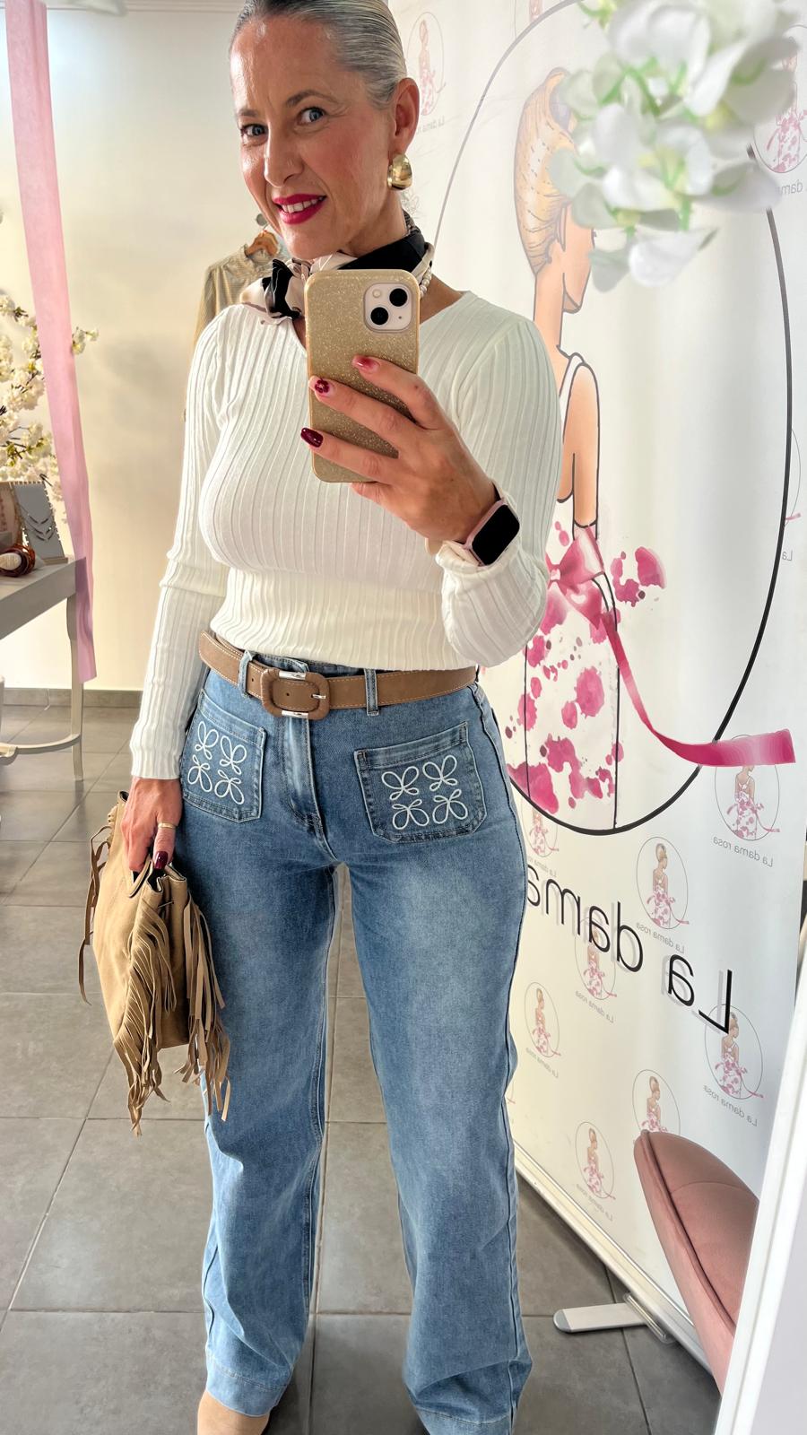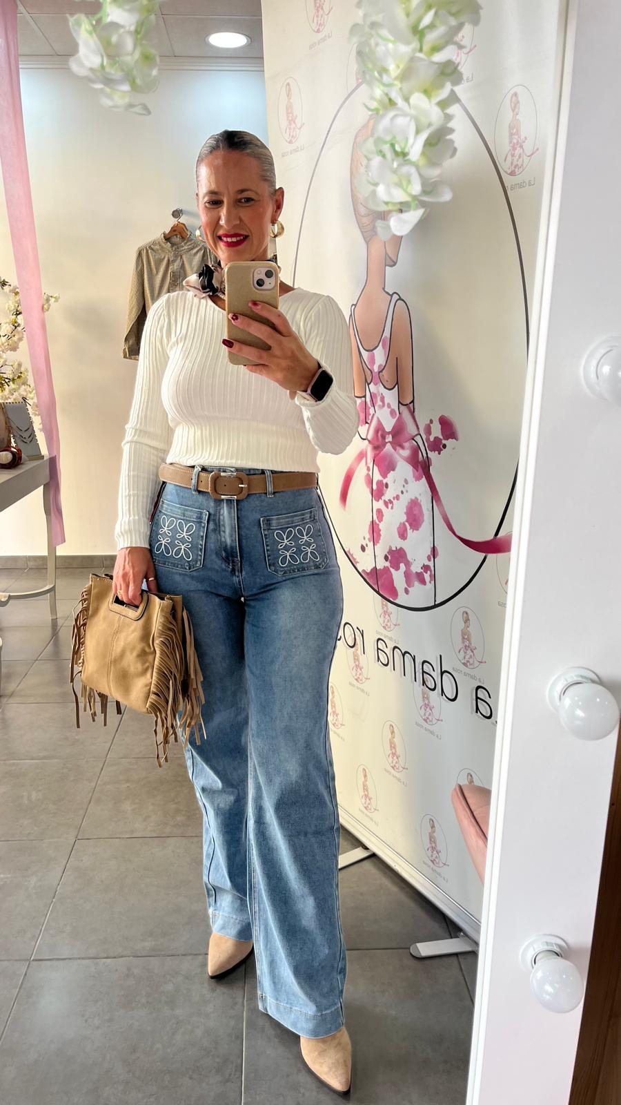 PANTALON VAQUERO,POCO ELASTICO,DETALLE DE BORDADO EN BOLSILLOS